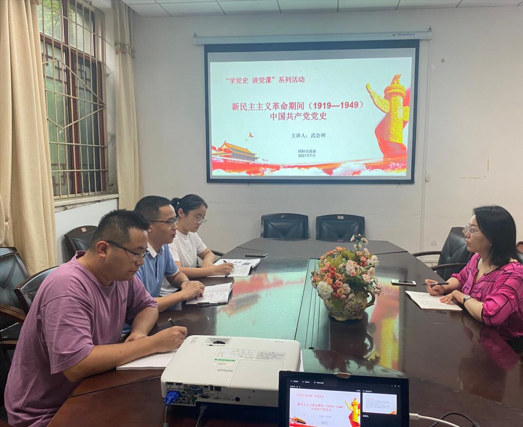 (通讯员钟伟)7月8日下午,国际交流处党支部组织开展“学党史、知党史、讲党史”支部成员讲党课系列活动。支部成员武会利以《新民主主义革命期间(1919-1949)中国共产党党史》为题,为支部全体党员上了一堂精彩生动的党课,带领大家重温新民主主义革命历史,汲取奋进力量。