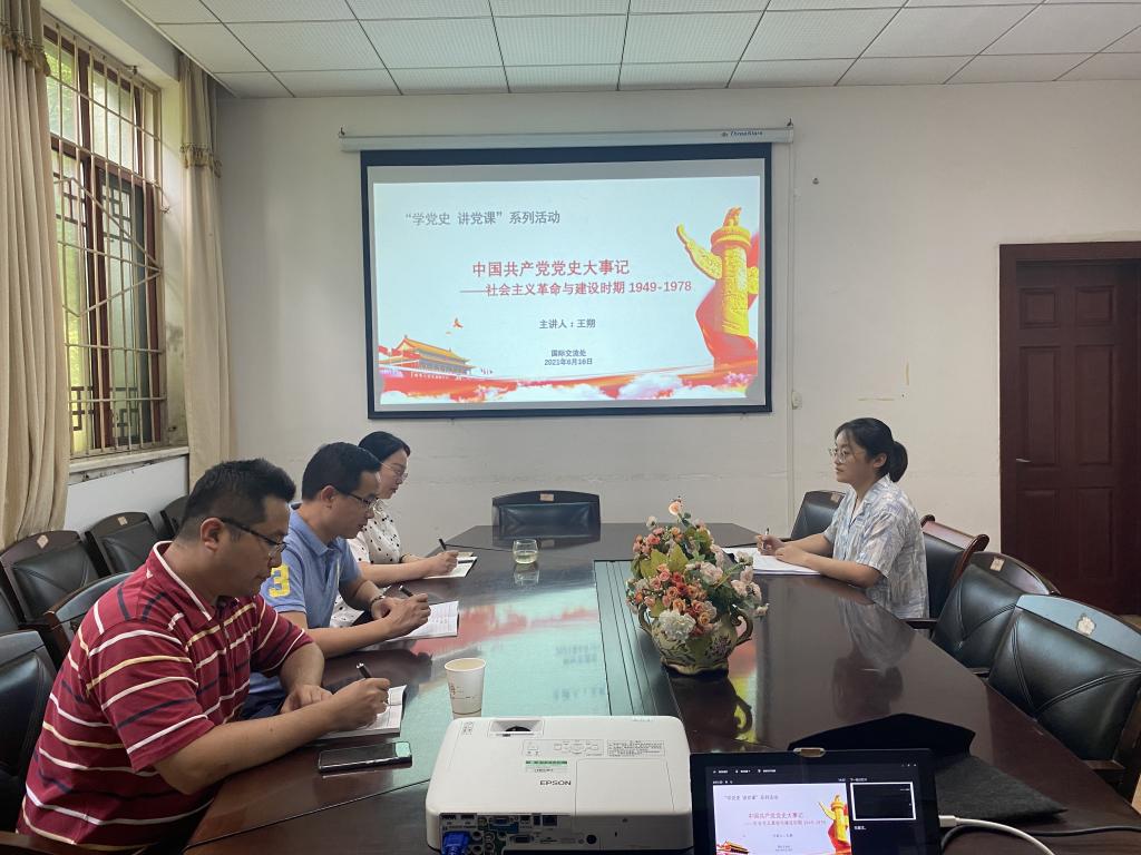 (通讯员钟伟)根据《机关党委关于开展党史学习教育实施方案》有关要求,6月16日下午,国际交流处党支部开展“牢记党的奋斗路,百名党员讲党史”主题党日活动,深入推进党史学习教育。支部成员王朔以《中国共产党党史大事记——社会主义建设时期(1949—1978)》为题讲授专题党课。