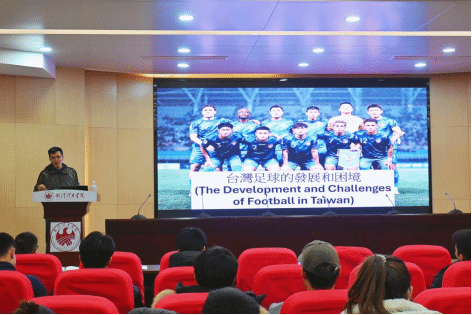 3月18日下午,由武汉体育学院港澳台事务办公室主办的专题讲座《中国台湾足球的发展与困境》在我校举行。本次讲座特邀台湾体育运动大学体育学系盂峻玮教授担任主讲。国际交流处(港澳台事务办公室)处长杜更、副处长昌志刚、办公室主任毕烨及广大师生参加活动。讲座由杜更主持。